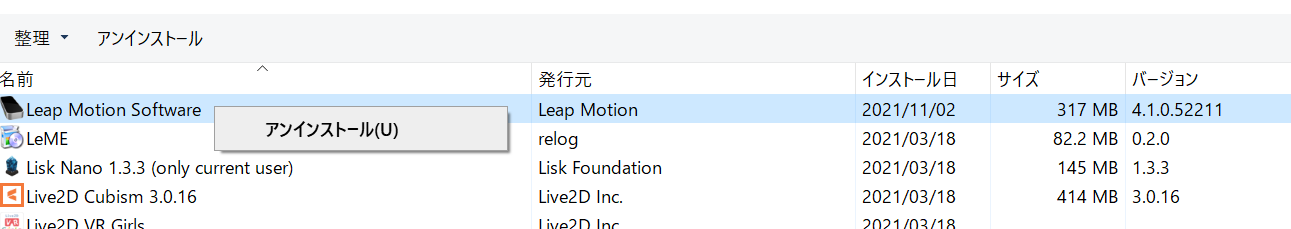 その後、一覧に並ぶアプリのうち、「Leap Motion Software」を右クリックしアンインストールしてください。