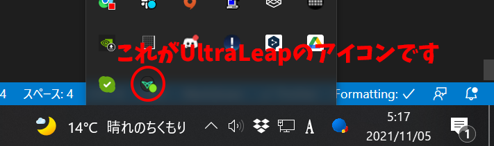 Windows の右下のアプリアイコン表示部分(上矢印のマークを押して表示されるもの)に UltraLeap のアイコンがあるはずです。