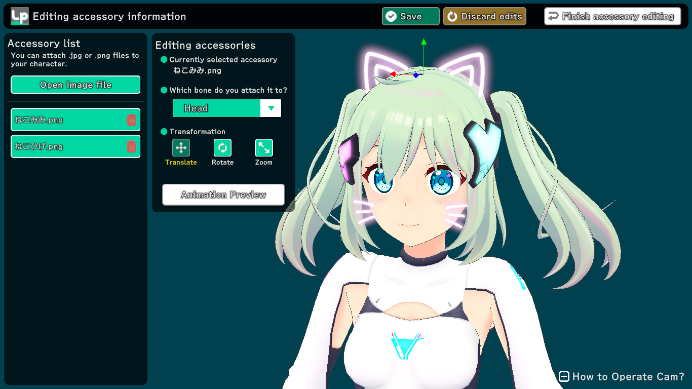 Once the image (=accessory) is added, you can move and rotate it, and choose which bone it should be attached to.