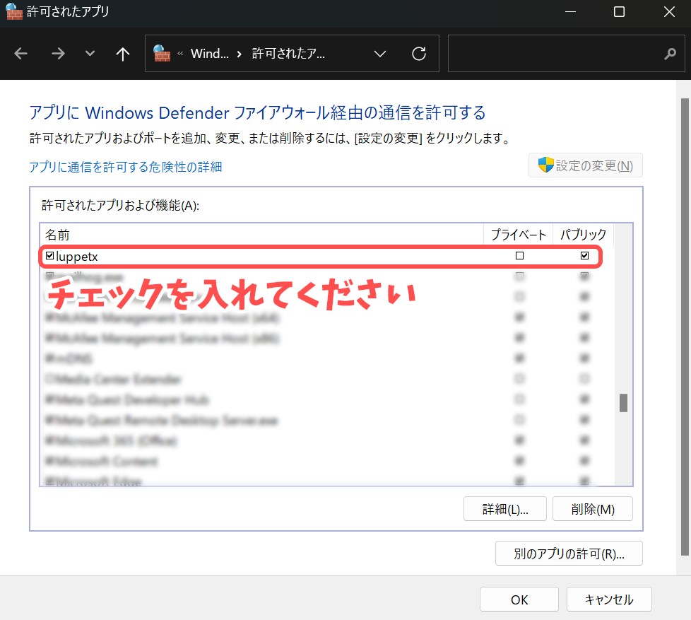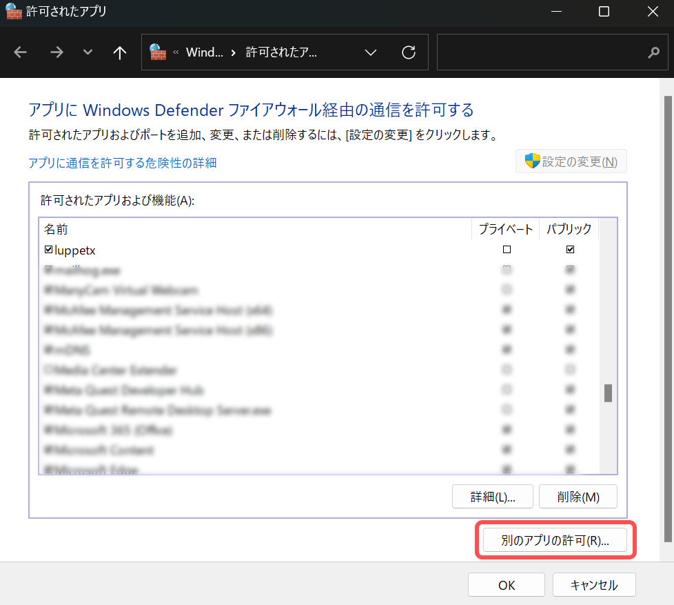 「luppet」のファイアウォール経由の通信を許可したうえで再度お試しください。