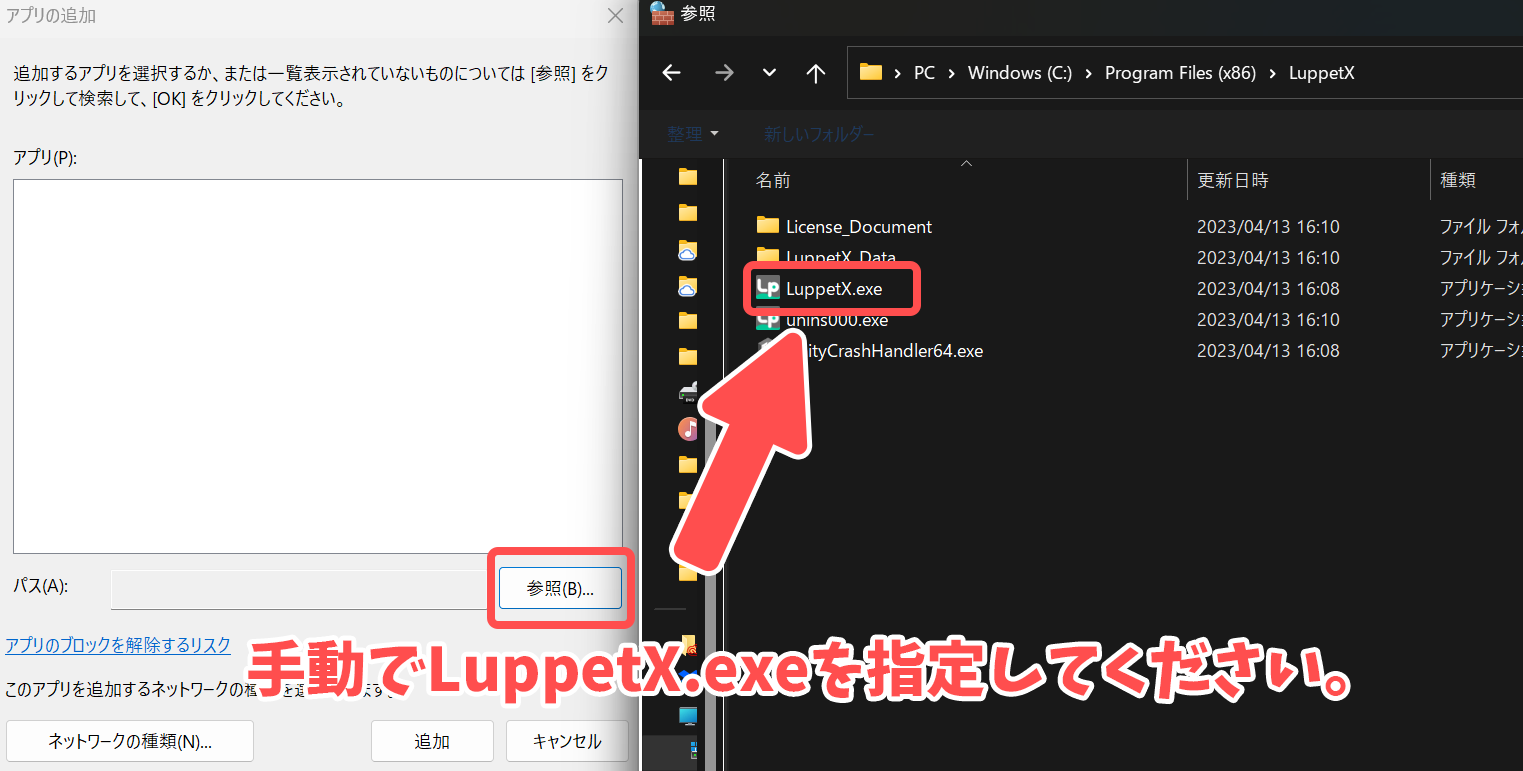 先程の画面から手動で LuppetX.exe を指定してください。