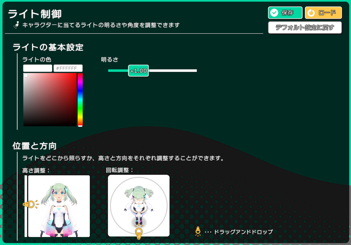ライト制御 ライトの基本設定 ライトの色や明るさを設定することができます。 基本的にはそのままにしておくことが推奨されます。 位置と方向 ライトをどこから照らすのか設定することができます。 情報 ポストプロセスによるBloomやExposureなどは、利用される割合が低く、かつアプリの動作を遅くする原因であったためLuppetXには搭載されていません。
