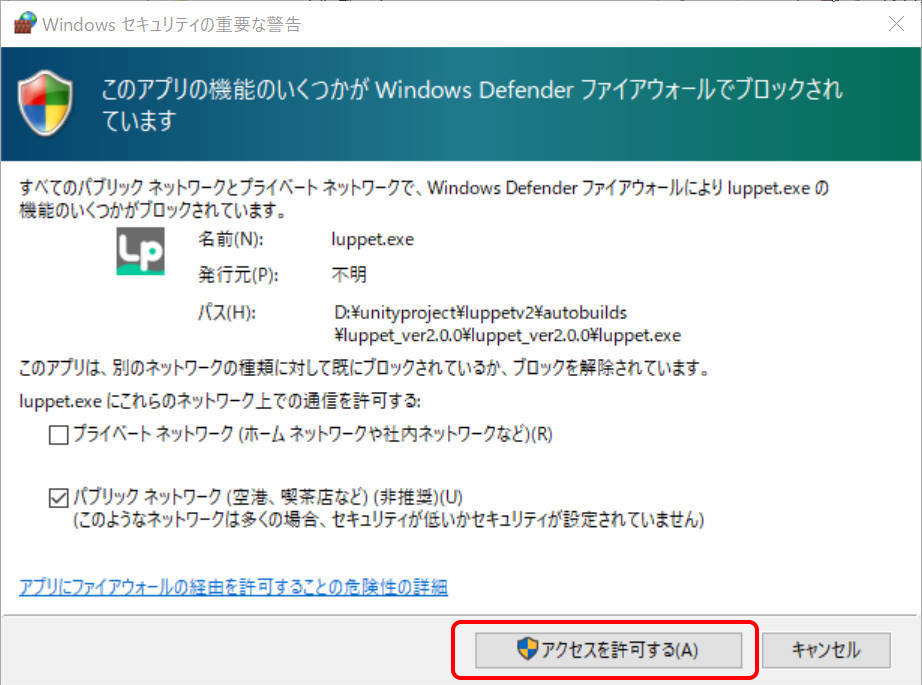 (これを許可しないとiOS端末から送られてくるモーションデータをLuppetが受け取れません。